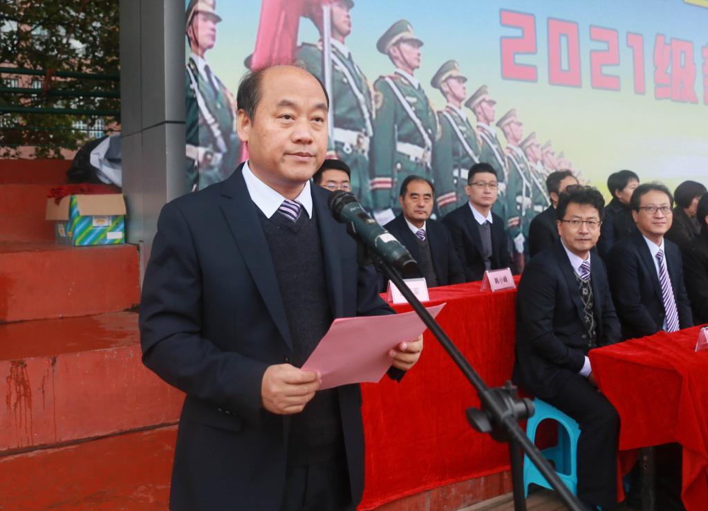 最后,副校长梅创社宣布军训团编制及任命。党委书记惠朝阳宣布2021级新生军训正式开营。