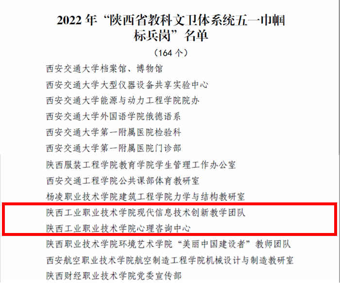 在“五一”国际劳动节到来之际,为大力弘扬劳模精神、劳动精神、工匠精神,激励广大女职工奋进新征程、建功新时代,近期,陕西省教科文卫体工会对2022年陕西省教科文卫体系统“五一巾帼标兵岗”和“五一巾帼标兵”进行了通报表彰,我校现代信息技术创新教学团队、心理咨询中心2个单位荣获“陕西省教科文卫体系统五一巾帼标兵岗”荣誉称号,邓丽萍、李云、薛媚3位女同志荣获“陕西省教科文卫体系统五一巾帼标兵”荣誉称号。