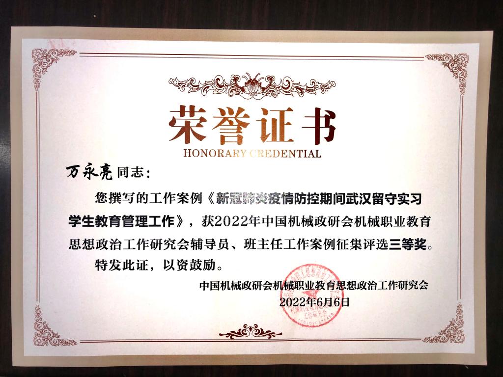 近日,2022年中国机械政研会机械职业教育思想政治工作研究会辅导员、班主任工作案例征集评选活动结果公布,我校韩家玉、万永亮、郝一甲三位辅导员撰写的《“五心”共育 点亮希望--“校园贷”引发退学问题的危机干预》《新冠肺炎疫情防控期间武汉留守实习学生教育管理工作》《因势利导,“五需”化人》工作案例在此次评选中分获一等奖、三等奖、优秀奖。