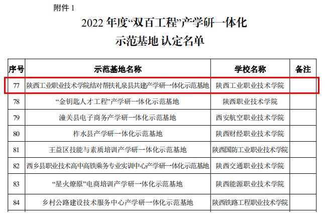 近日,中共陕西省委教育工作委员会下发了《关于认定2022年度“双百工程”产学研一体化示范基地和实体项目的通知》(陕教工函〔2023〕43号),分别认定了105个基地以及26个项目为2022年度陕西省“双百工程”产学研一体化示范基地和实体项目,我校结对帮扶礼泉县共建的“星空web版登录入口产学研一体化示范基地”被认定为2022年度陕西省“双百工程”产学研一体化示范基地。