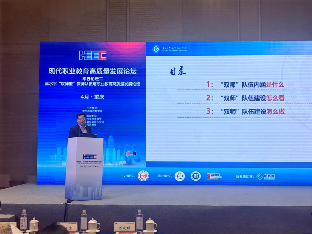 作为第58·59届中国高等教育博览会的主论坛之一,高水平“双师型”教师队伍与职业教育高质量发展论坛在重庆市悦来会议中心欣悦厅B举行。本次论坛以“打造‘双师’新范式 校企协同促发展”为主题,中国高等教育学会副会长、江苏省政协教卫体委员会主任葛道凯,教育部职业教育与成人教育司副司长林宇,教育部教师工作司副司长翁波,重庆市委教育工委委员、市教委副主任李劲渝,机械工业教育发展中心主任、中国机械工业联合会教育培训部主任陈晓明等领导专家出席会议,市内外职业院校领导、企业领导、专家学者、院校教师代表、星空(中国)媒体等3万余人通过线上线下方式参加论坛,共研高水平“双师型”教师队伍建设发展路径。本次论坛由中国高等教育学会主办,重庆工业职业技术学院、国药励展展览有限责任公司等承办。