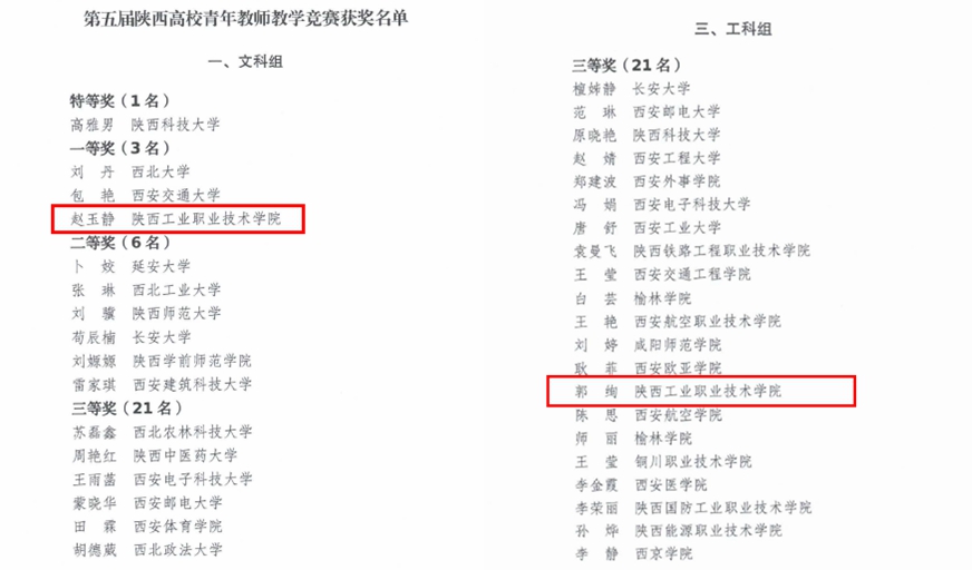 近日,第五届陕西高校青年教师教学竞赛结果正式公布,财经与旅游学院赵玉静斩获文科组一等奖、信息工程学院郭绚获工科组三等奖,获奖数量位居陕西省高职院校首位,也是唯一获得一等奖的高职院校。