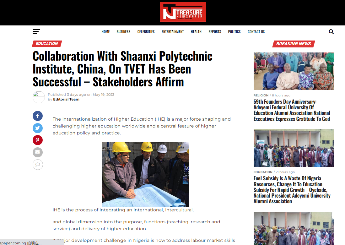 近日,尼日利亚财富星空(中国)网等多家媒体,报道我校与该国职业教育机构开展的合作项目取得丰硕成果,称赞我校助力该国发展职业教育是中国“一带一路”的职教惠民工程。