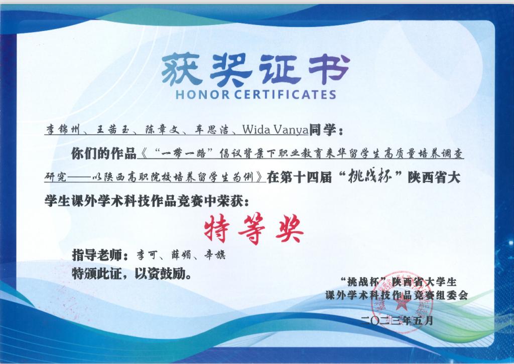 我校国际教育学院李可、辛旗老师及团委薛媚老师指导的学生参赛作品《“一带一路”倡议背景下职业教育来华留学生高质量培养调查研究——以陕西高职院校培养留学生为例》荣获特等奖,实现了我校参加挑战杯大赛以来在哲学社科领域获奖的一大突破。该作品也作为省内高职院校唯一代表作品,在大赛颁奖仪式上与我省三所知名本科院校同台汇报展示,受到了广泛好评,为高职院校在该领域的纵深探索树立了良好的“职业品牌”标杆。