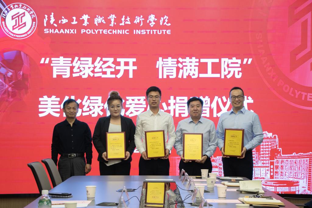 5月30日下午,“青绿经开 情满工院”美化绿化爱心捐赠仪式在经开校区图文信息中心7层会议室举行。北京精雕科技集团西安分中心副总经理关山、咸阳一都商务酒店有限公司董事长高瑞平、陕西彩食之家商贸有限公司总经理张伟、陕西沐云水天餐饮管理有限公司总经理刘宁,我校党委副书记贺天柱,以及学校相关部门负责同志出席了捐赠仪式。仪式由经开校区管委会综合办公室主任李龙主持。