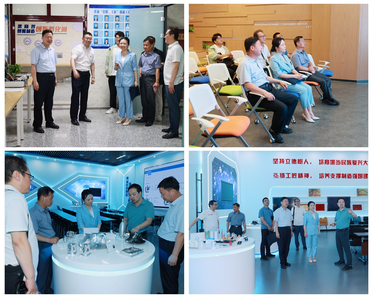 在党委副书记贺天柱的陪同下,彭晶一行参观了我校学马研习VR实训基地、智能制造职工创新工作室、先进制造精雕产业学院、5G材料成型实训基地,参观期间,彭晶部长饶有兴趣地和相关同志就学校在产教融合、校企合作、技术创新等方面的取得的建设成效作了深入交流,充分肯定我校工会深化职业教育助推产业工人队伍建设改革试点工作中取得成绩。