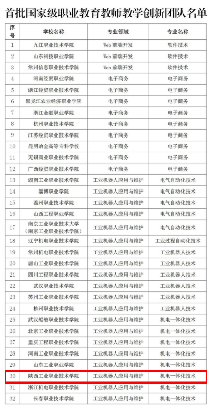 根据2023年6月26日《教育部关于公布首批国家级职业教育教师教学创新团队名单的通知》(教师函〔2023〕5号),我校机电一体化技术专业教师教学创新团队通过教育部首批国家级教师教学创新团队认定,本次认定是我校师资队伍建设取得的重大成果。