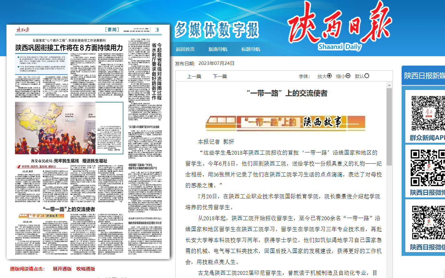7月24日,《陕西日报》以《“一带一路”上的交流使者》为题,专题报道我校为“一带一路”沿线国家和地区培养技术技能人才的事迹,全文如下: