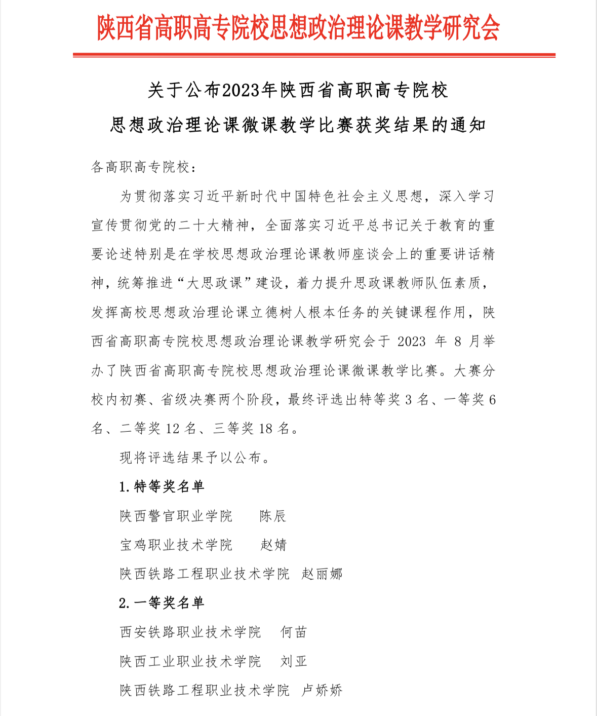 近日,在2023年陕西省高职高专院校思想政治理论课微课教学比赛中,我院教师刘亚荣获一等奖。