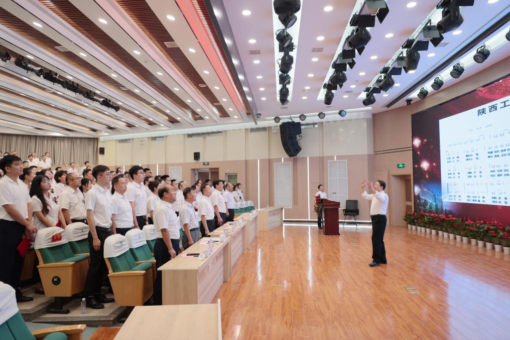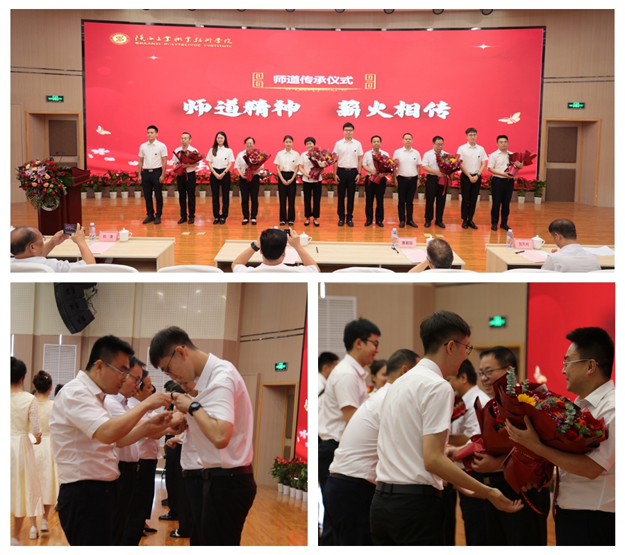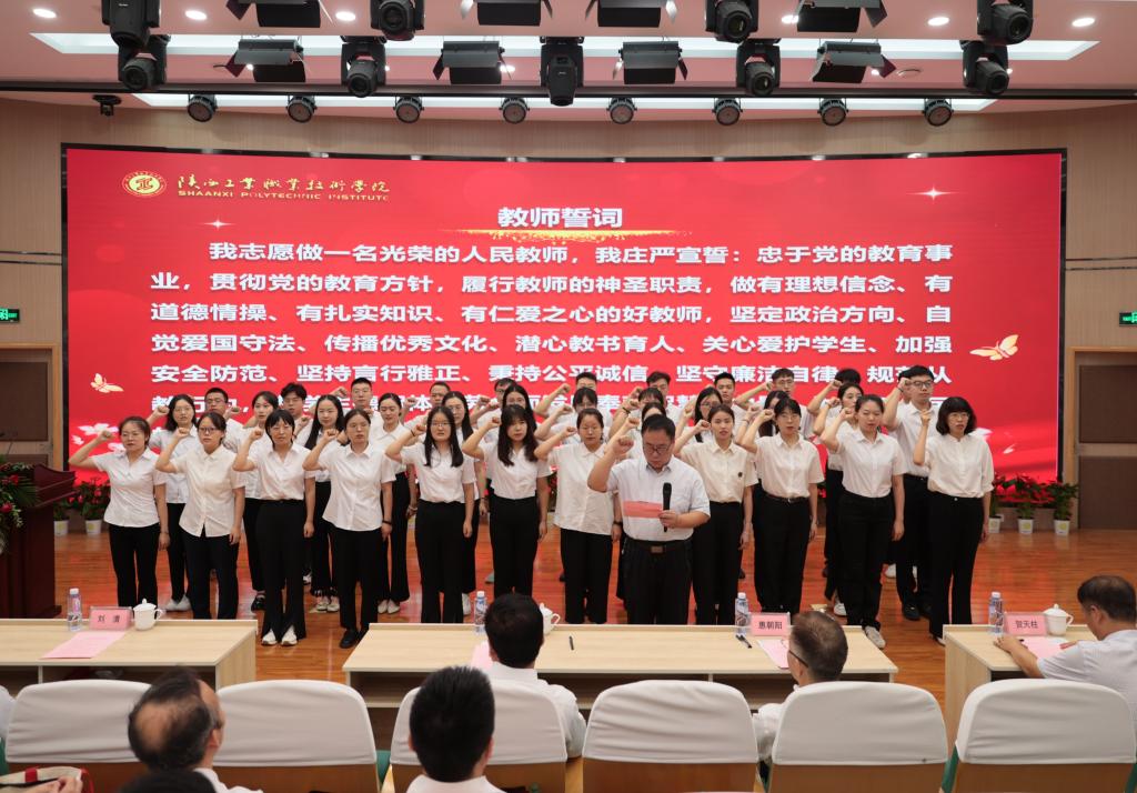 大会在雄壮的国歌声中拉开帷幕。副校长梅创社宣读了表彰决定,大会向过去一年中荣获国家级、省、市级荣誉,指导学生大赛荣获奖项,为学院发展做出突出贡献的先进集体和个人进行表彰并颁发荣誉证书。传承师道精神,立德树人薪火永续。会议隆重的举行了薪火相传师道传承仪式,老教师尚华、卢庆林、张翠花、祝战科、李爱国、来保卫上台为新进教师代表佩戴校徽,青年教师为师德先进教师送上节日鲜花和祝福。随后,领誓人祝战科带领全体新入职老师进行庄严宣誓,会场上嘹亮的声音,铿锵的誓言,展现着新进教师昂扬向上的精神风貌和投身教育事业的志向和决心。