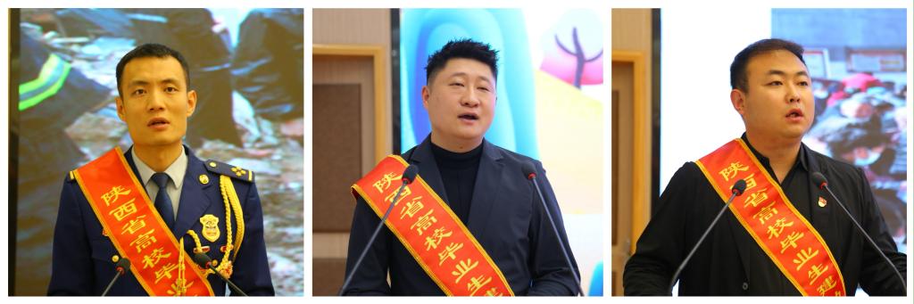 分享活动上,人民的忠诚卫士、陕西消防总队一级助理员,毕业于西安石油大学的张瑞超围绕《在血与火中淬炼青春》的主题,讲述了自己从一名基层的消防员到消防总队一级助理员的历程,鼓励同学们在面对挫折时,永不言弃,勇敢前行。全国优秀养老护理榜样人物、陕西敬老爱老助老十大善星、陕西新聚福琳养老服务有限公司总经理,毕业于咸阳师范学院的王旭东以《孝老爱亲赓续传统挥洒青春守护夕阳》为主题,与同学们分享了自己的创业历程,讲述了他一直以来秉承对行业的热爱,为养老事业贡献着自己的青春力量。商洛市商州区兴盛村党支部书记、村委会主任,毕业于陕西交通职业技术学院的郭旭以《扎根基层用实干书写青春担当》为题,讲述了自己带领全体村民励精图治,锐意进取,从一名大专毕业生成长为一名合格的党支部书记、村委会主任,鼓励同学们要投身基层事业,助力乡村振兴,在新时代建功立业。