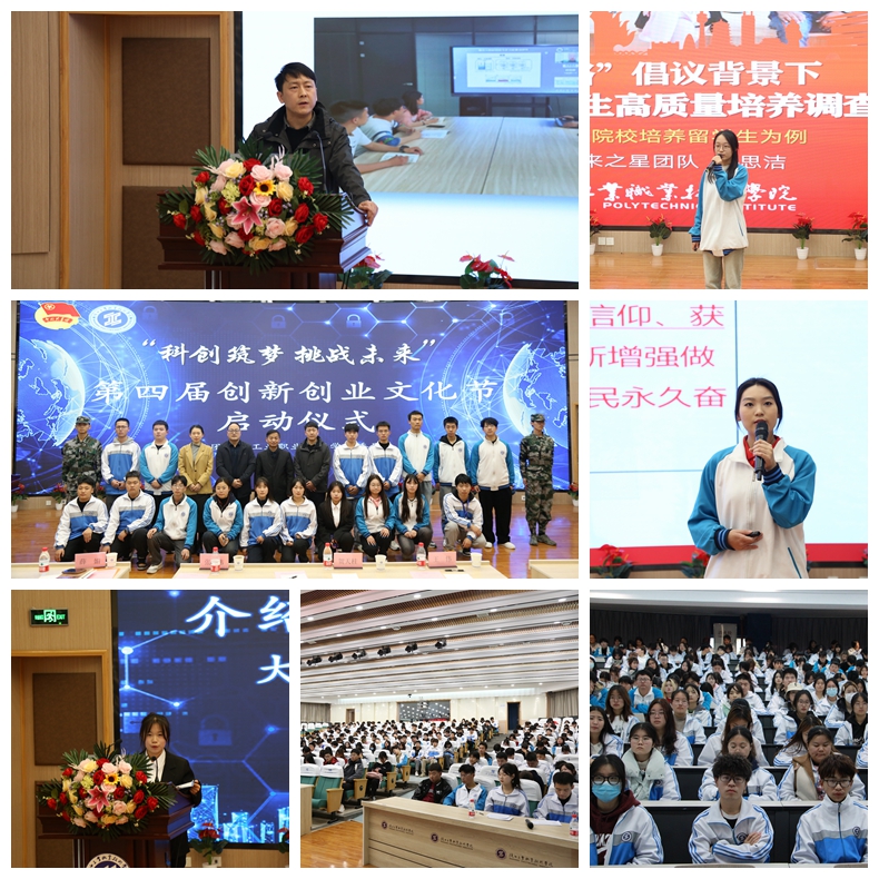 本届创新创业文化节的启动仪式分为两个阶段。第一阶段,首先由团委书记薛媚宣读学校《第四届创新创业文化节活动方案》。接着,分别由“挑战杯”大学生课外学术科技作品竞赛国赛三等奖、省赛特等奖《丝路留学 共筑未来:职业教育来华留学生高质量培养与赋能“一带一路”国际产能合作调查研究》团队的信息工程学院数媒2207车思洁同学以及“挑战杯”大学生课外学术科技作品竞赛红色专项活动省赛一等奖《重温大生产 再唱南泥湾——南泥湾精神赋能“乡村振兴”实践探究》团队的材料工程学院增材2201王诗雨同学进行路演展示;创新创业导师王伟老师,分享指导“双创”竞赛经验;大学生创新创业实践中心学生负责人张凯玥同学通报文化节五个活动概况;随后,党委副书记贺天柱作了题为“创新驱动聚才汇智 创业兴邦护航梦想”的讲话,他对同学们提出三点要求,一是刻苦学习、勇攀高峰,二是磨砺本领、淬炼技艺,三是躬身时间、知行合一,并希望同学们怀揣科创报国、技能报国的理想,主动应对新时代的挑战,磨砺过硬本领、淬炼精湛技艺,行走在自立自强科技兴国的最前沿,肩负起青年人的历史使命,用青春为科技赋能,让技能在创新中发光。