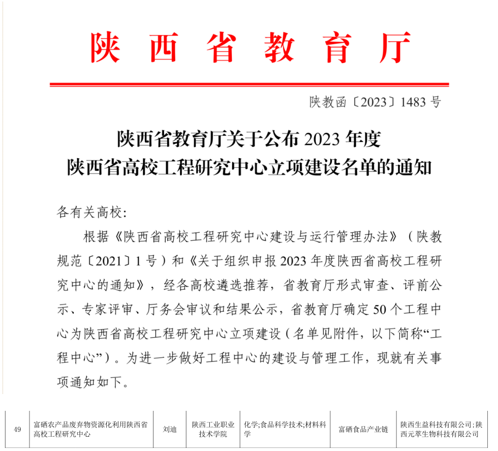 近日,根据《陕西省教育厅关于公布2023年度陕西省高校工程研究中心立项建设名单的通知》(陕教函【2023】1483号)文件,我校化工与纺织服装学院依托校级重点研发平台应用化工技术研发中心申报的富硒农产品废弃物资源化利用工程研究中心获批陕西省高校工程研究中心,该中心由我校牵头,联合陕西生益科技有限公司和陕西元萃生物科技有限公司共同建设,化工与纺织服装学院刘迪教授担任研究中心主任。