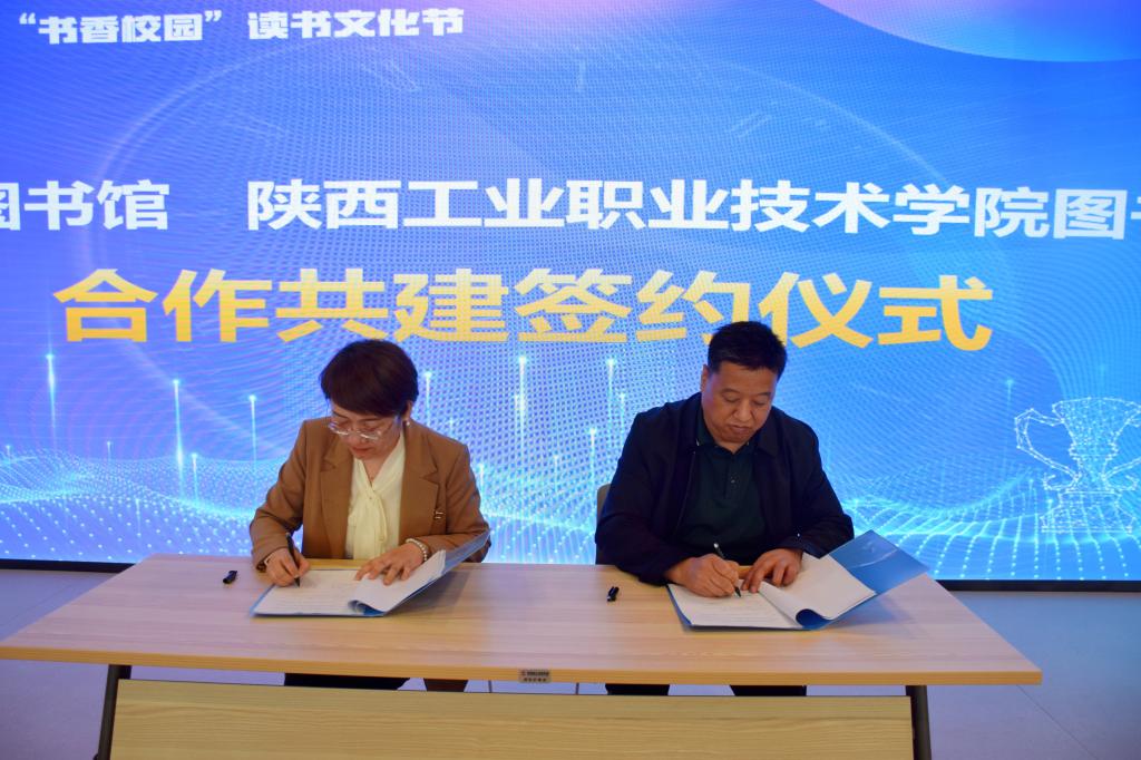 随后,咸阳图书馆馆长杨岳与我校图书馆馆长王丁共同签署合作共建协议。标志着两馆将在数字资源共享机制、馆藏数据库互查互访、阅读推广活动、业务培训和学术交流、课题研究项目、“社会实践基地”和“志愿者服务基地”等方面开展更深入的合作建设。
