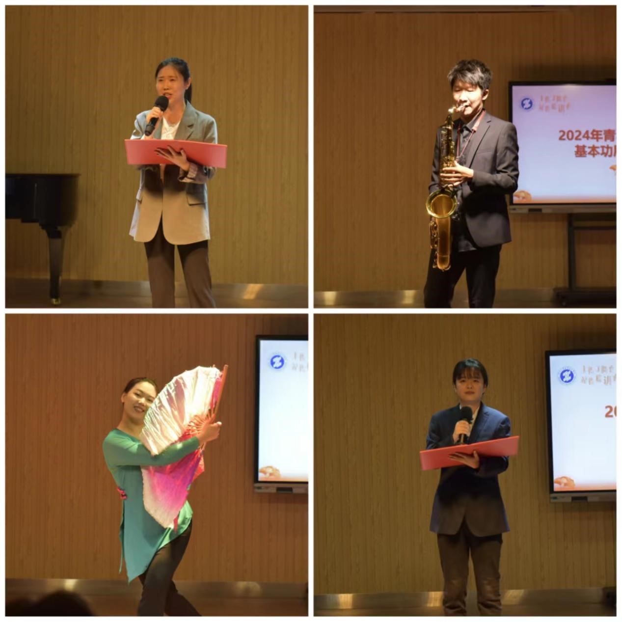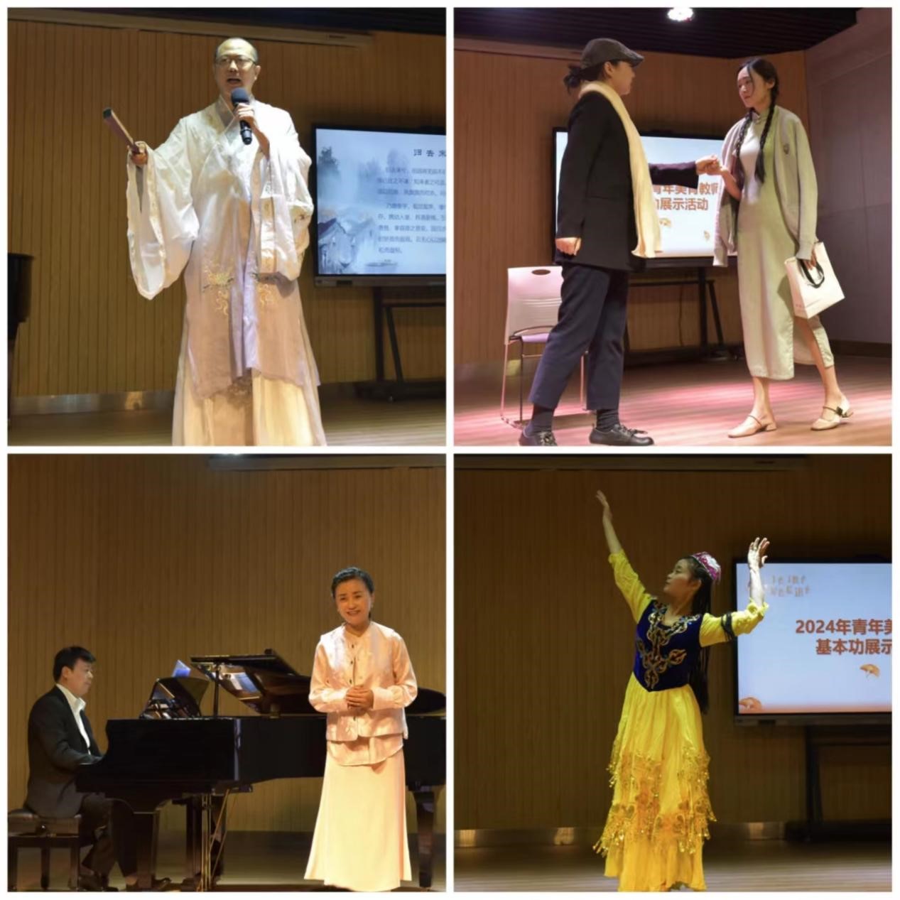 首先进行艺术专业能力展示环节,美育部教师们纷纷显露才艺,进行艺术专业能力展示,内容涵盖舞蹈、戏剧、朗诵、器乐、声乐等多个艺术门类,或翩翩起舞,或高歌一曲,或弹奏生活,或演绎人生,精彩荟萃的表演让人眼前一亮,丰富多变的艺术形式令人目不暇接。