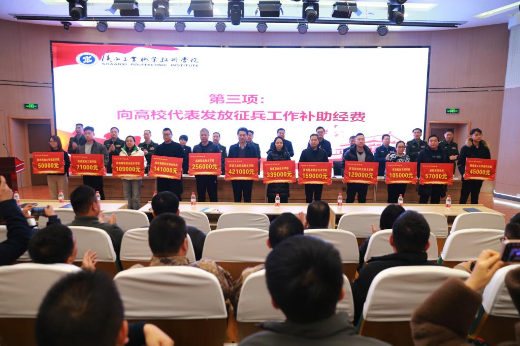咸阳市政府副秘书长韩雷同志宣读了《关于发放2023年普通高等学校、高级技工学校和技师学院征兵工作补助经费的通知》,在场领导向辖区学校代表颁发了征兵工作补助经费。咸阳军分区副司令员刘通柱对各学校征兵工作寄予殷切希望,他强调各高校要高度重视征兵工作,向学生宣传好国家优待政策,为部队输送优秀大学生。同时,他也希望青年学生能充分认识到部队独特的成长平台,积极踊跃到绿色军营中去建功立业,让青春在强军兴军事业中焕发光彩!