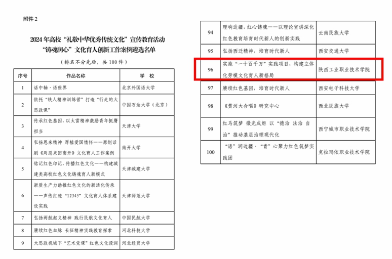 近日,教育部公布了2024年高校“礼敬中华优秀传统文化”宣传教育活动结果。我校工作案例《实施“一十百千万”实践项目,构建立体化劳模文化育人新格局》成功入选“铸魂润心”文化育人创新工作案例遴选名单,是全省唯一荣获此殊荣的高职院校。
