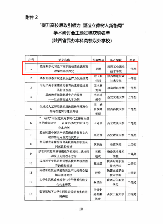 近日,陕西省高等学校思想政治教育研究会组织开展了“提升高校思政引领力 塑造立德树人新格局”学术研讨会主题征稿活动。我校教师孙静、陈杜昊撰写的《教育数字化背景下高职院校思政课精准教学的路径探究》《教育强国建设背景下高职院校思政课改革创新路径研究》从144篇参评稿件中脱颖而出,分别荣获民办本科高校以外学校组别一等奖和优秀奖。