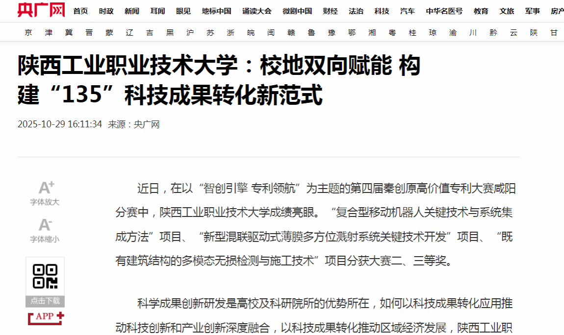 近日,在以“智创引擎 专利领航”为主题的第四届秦创原高价值专利大赛咸阳分赛中,陕西工业职业技术大学成绩亮眼。“复合型移动机器人关键技术与系统集成方法”项目、“新型混联驱动式薄膜多方位溅射系统关键技术开发”项目、“既有建筑结构的多模态无损检测与施工技术”项目分获大赛二、三等奖。