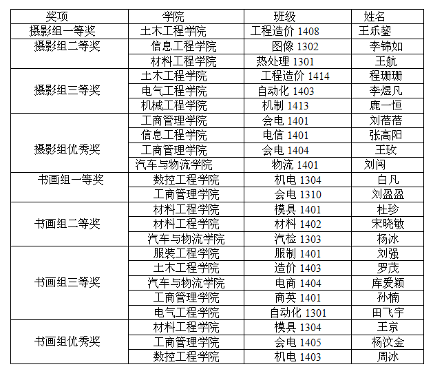 本次活动持续展出两天,共有150副作品参加展出。这些作品中有古色古香的隶书、潇洒飘逸的行书、还有展现传统文化的国画、充满“洋味儿”的漫画,更多的是展现我院美丽风光的摄影作品,充分体现了“多彩视觉”的活动主题,受到师生们的一致好评。为了鼓励大家积极参与,展览后这些作品被分为书画和摄影两类进行了评选,评出一二三等奖和优秀奖若干(获奖名单表见表)。