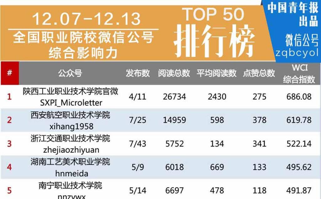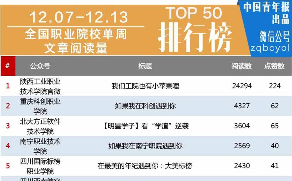 “全国职业院校微信公号排行榜”是中国青年报按周将全国职业院校微信推送的后台反馈数据进行排名,以真实的数据反映各高校官方微信的综合影响力及文章阅读量。数据的背后,是高校之间文化软实力的PK,更是广大网友对大学文化魅力的认可和赞许。