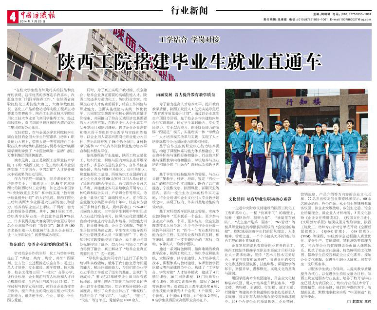 7月23日,《中国纺织报》以《工学结合、学岗对接,陕西工院打造毕业生就业直通车》为题聚焦我院化工纺织专业人才培养。全文如下: