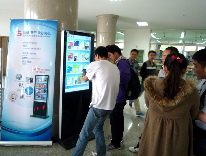 该项服务通过电子书自助借阅机来实现。借阅机通过多点触控进行操作,支持滑动、拖动等手势。读者只要用手指轻轻地碰触显示屏上的图片就能实现对主机的操作。借阅机上配置了内容涵盖科学技术、文学艺术、经济管理等领域的精品图书2000册,并且每月会根据下载情况进行更新。读者可以使用手机、平板电脑及其他设备通过扫描二维码对借阅机提供的电子书籍进行下载阅读。借阅系统客户端有Android系统和苹果系统两种。下载之后的电子书籍保存在终端设备上,用户可以在任何时间、任何地点方便地进行阅读。电子书的借阅期限是45天,到期后将需要重新下载。
