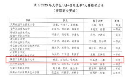 11月30日,由教育部高等学校图书情报工作指导委员会指导、2025 年大学生“AI+信息素养”大赛组委会主办的2025年大学生“AI+信息素养”大赛全国联赛在成都圆满落幕。我校信息工程学院党彬晟、化工与纺织服装学院秦磊、土木工程学院彭高彧组建的“要做就做南波万队”凭借扎实的专业基础、出色的团队协作能力,荣获一等奖;信息工程学院马文洁、化工与纺织服装学院柴泽琦、机械工程学院闫玉涵组建的“天天向上队”荣获三等奖。指导教师祝嘉欢、王璐、王丁、赵咪获全国联赛“优秀指导教师”称号。