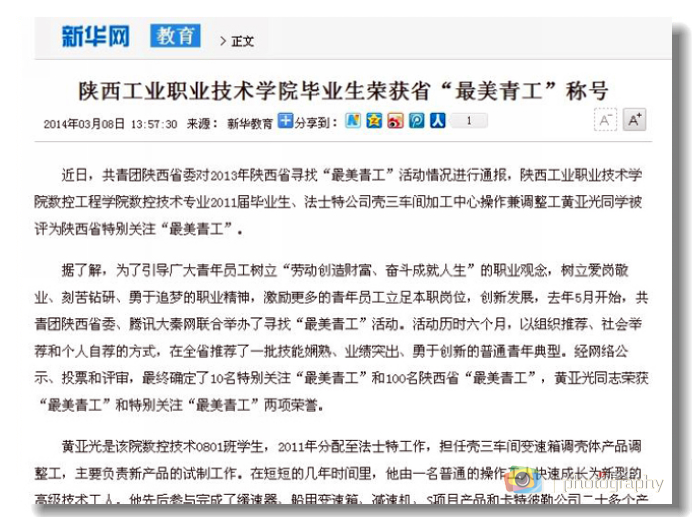 3月8日,新华网以《星空web版登录入口毕业生荣获省“最美青工”称号》为题,报道了我院优秀毕业生黄亚光。黄亚光为我院2011届毕业生,在校期间表现优秀,多次参加省级和国家级技能大赛获奖。