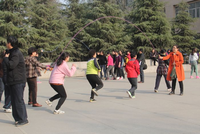 比赛虽因雨延期举行,但女教职工们的参赛热情丝毫不减,不少代表队早早召集人马来到赛场热身。比赛一开始,选手们立即投入到热闹欢腾的跳绳接力和六人齐跳队伍中去,赛场内人头攒动,热闹非凡。参赛队员全神贯注,积极应战;裁判员聚精会神,严格控时;记分员认真计数,一丝不苟;各代表队的啦啦队鼓掌加油、摇旗呐喊;摇绳声、鼓掌声、加油声、数数声,此起彼伏,回荡在赛场内外。无论准备上场,正在比赛,还是刚刚比拼结束的教职工都洋溢着欢乐的笑容。部分二级学院的领导亲临比赛现场,坐镇指挥并为队员们鼓劲、助威。赛场周围,很多没有参赛的教职工、家属和刚下课的学生都被吸引过来驻足观看。