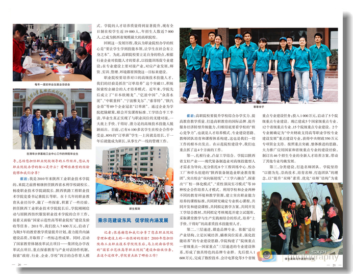 崔 岩:我是2010年来星空web版登录入口的,来院之前曾相继担任陕西省水利学校副校长、杨凌职业技术学院副院长、陕西铁路工程职业技术学院党委书记兼院长等职。在十几年的职业教育从业经历中做了一些探索,积累了一些经验。担任星空web版登录入口院长后,学院刚刚启动与原陕西纺织服装职业技术学院的合并工作,接着又面临“国家示范性高等职业院校”建设及验收等任务。2011年,学院跻身百所国家示范高职院校行列后,我们又投入7 600万元,启动了为期5年的教育教学质量提升计划,着力提升内涵建设品质,并取得了一些标志性成果。同时,启动了国家教育体制改革试点项目——集团化办学改革试点项目,重点探索教育与产业对话协作机制,探索“政府、行业、企业、学校”四方的合作育人模式。学院的人才培养质量得到显著提升,现有全日制在校学生近19000人,年招生人数近7 000人,已成为陕西省规模最大的高职院校。