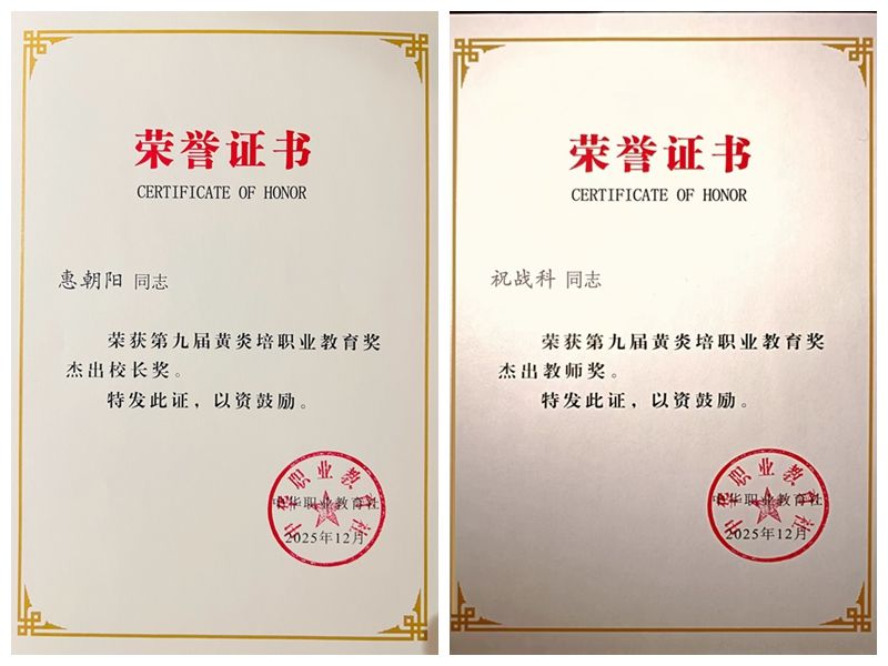 党委书记惠朝阳荣获第九届黄炎培职业教育奖杰出校长奖,祝战科教授荣获“杰出教师奖”。