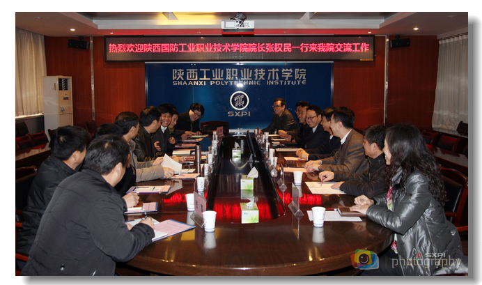 12月17日上午,陕西国防工业职业技术学院由院长张权民带队,副院长刘敏涵、党政办主任王建设、组织人事处处长李周平、学生处处长王朱劳、教务处处长全卫强、财务处处长罗锁哲、招就处处长吴君良、实践教学处张鑫等一行九人来我院考察交流。