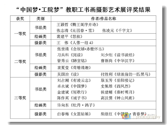 我院庆祝建校63周年“中国梦•工院梦”教职工书画摄影艺术展自11月15日开始展出以来,吸引了全院数百名师生前来观看,共收到观众投票126张。近日,经教职工书画摄影艺术展评委会结合观众投票联合评选,共评出书法、绘画、摄影类一、二、三奖作品24副(组)。