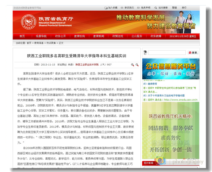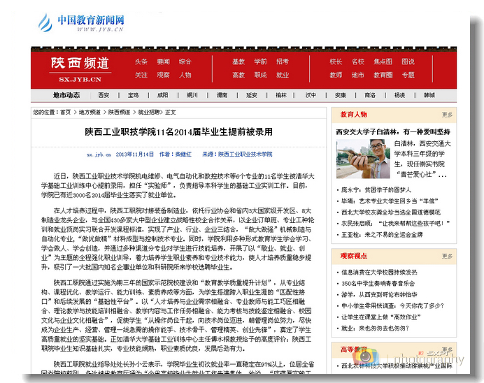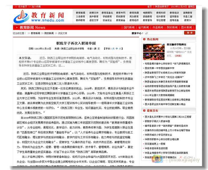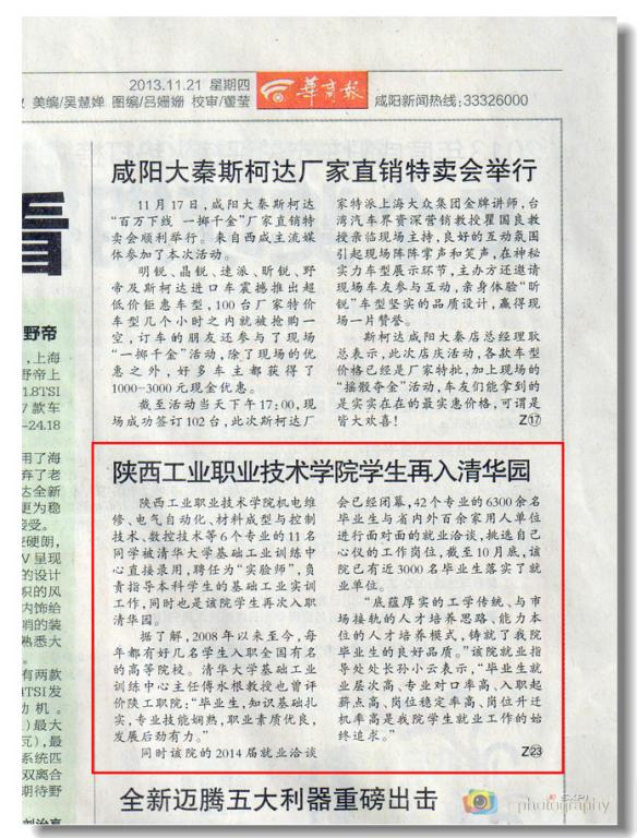11月26日,《陕西日报》科教版头条以“陕西工院11名毕业生入职清华园”为题刊发消息,对我院教育教学改革、毕业生就业等工作进行报道。《华商报》、中国教育星空(中国)网、陕西省教育厅网站、中国职业技术教育网、陕西教育网等多家媒体也分别进行了报道,各媒体链接如下:
