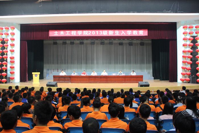 9月22日晚,土木工程学院在明德堂举行了2013级新生入学教育大会。保卫处处长屈军锋、教务处副处长赵明威、继续教育中心副主任李龙、学生处教育管理科科长王康虎应邀出席,土木工程学院党总支书记何克祥、院长贺天柱、副院长杨谦,学工办主任韩二豹、全体辅导员以及1283名新生参加了会议。大会由何克祥主持。