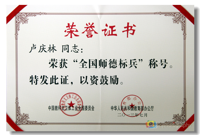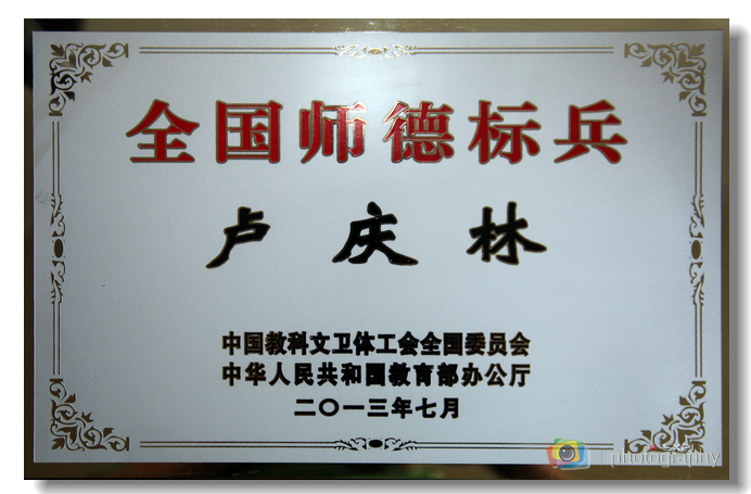 学高为师,德高为范。多年来,卢庆林同志待人诚恳,勤奋节俭, 关心教师,爱护学生,他执教的信条是“用知识去启迪学生心扉,用严教去规范学生行为,用爱心去感受学生真情,用关爱去指导学生成长。”