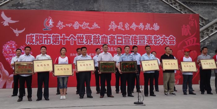6月14日,由咸阳市委宣传部、咸阳市军分区后勤部、咸阳市文明办、共青团咸阳市委、咸阳市红十字会、咸阳市献血管理委员会和咸阳市卫生局联合主办的咸阳市第十个世界献血者日宣传暨表彰大会在咸阳钟楼广场举行,今年献血者日的主题是“每一份献血都是生命的礼物”,大会宣布了咸阳市《关于表彰无偿献血先进集体的决定》,我院及陕西预备役某师等25个单位被授予“无偿献血先进集体”荣誉称号。