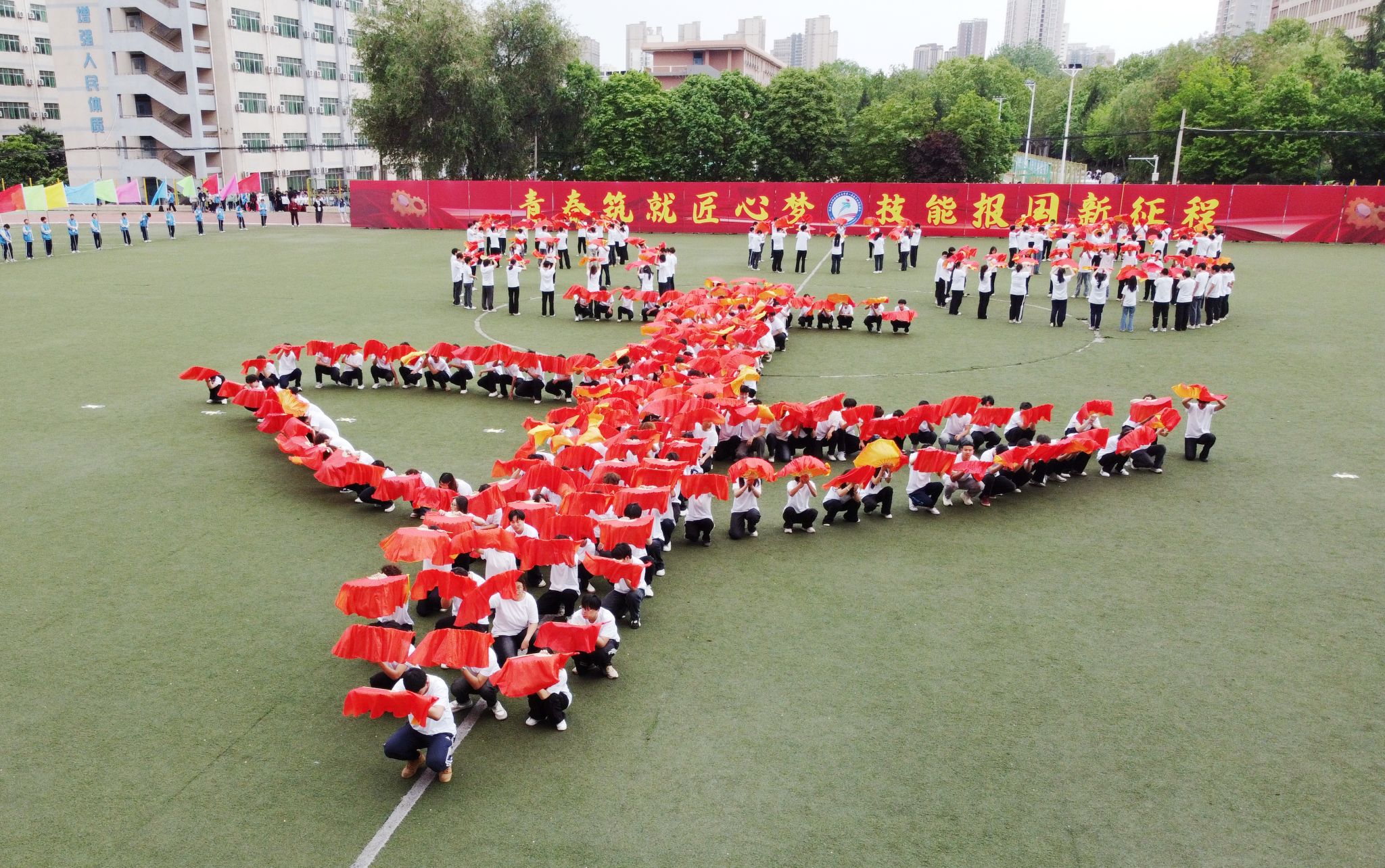 活力满满的文艺表演将氛围推向高潮。《旗舞工魂》以方阵之严整、波浪之灵动、圆形之团结,巧妙地将专业特质融入艺术编排,具象化了青年的“刚毅与坚韧”;《丝韵舞芳华 万疆启新程》以彩绸翩跹起舞,用青春的肢体语言,生动展现了陕工青年学子的蓬勃生机与无限创意;《扇舞苍穹 航启华章》在绿茵场上汇聚成红黄两色的海洋,变换出花朵、种子、长城、波涛、校徽、飞机与奥运五环的壮丽队形,祝福学校“根植职教沃土,腾飞万里长空”;《智汇AI 引领未来》擎起百米红绸如双龙入场,学子们依次变换的造型,寓意着一代代陕工人赓续陕工精神,传承创新红色匠心文化,为建设一流职业技术大学接续奋斗;《匠心驰骋》的学子们用手中的红黄伞诠释出学校“用革命的精神创办革命的学校”的勇立潮头、工心报国的鼎兴史;《锦武师风 星河共往》以“八段锦”为载体,于动静之间诠释“以柔克刚、以静制动”传统智慧,既彰显师者儒雅风华,亦展现昂扬向上精神风貌;《舞韵风华 筑梦工大》以一袭红裙、一把红扇,诠释着陕工青年牢记“明德笃学、精艺强身”校训,共绘学校职教改革发展排头兵的宏伟蓝图。