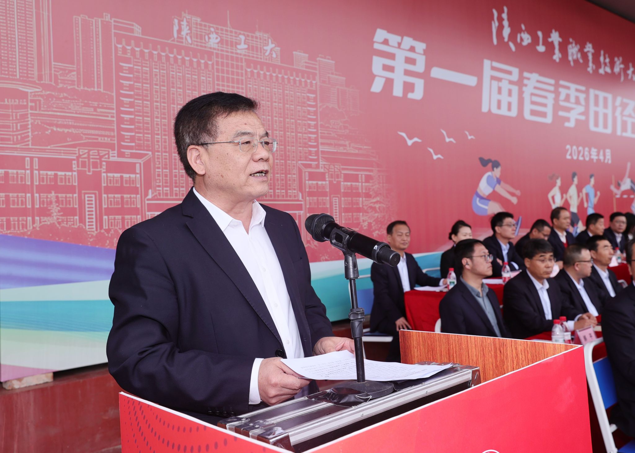 刘永亮在致辞中指出,体育是立德树人、五育并举的重要载体,是强健体魄、砥砺品格、凝聚力量的生动课堂,学校始终响应国家“深化体教融合”号召,把体育育人摆在突出位置,坚持“健康第一”的教育理念,把体育精神融入人才培养全过程,以体育人、以体润心,引导广大师生在运动中强意志、塑品格、展风采。他希望全体师生,在运动中体悟生命活力,在拼搏中收获成长喜悦,在赛场中绽放青春锋芒,在汗水与坚守中磨砺坚韧意志、涵养自强品格,以昂扬姿态展现新时代陕工大师生的最优风貌,以更加昂扬的精神、更加健康的体魄、更加务实的作风,凝心聚力、勇毅前行,在职业本科的新赛道上跑出加速度、彰显新担当、书写新辉煌!