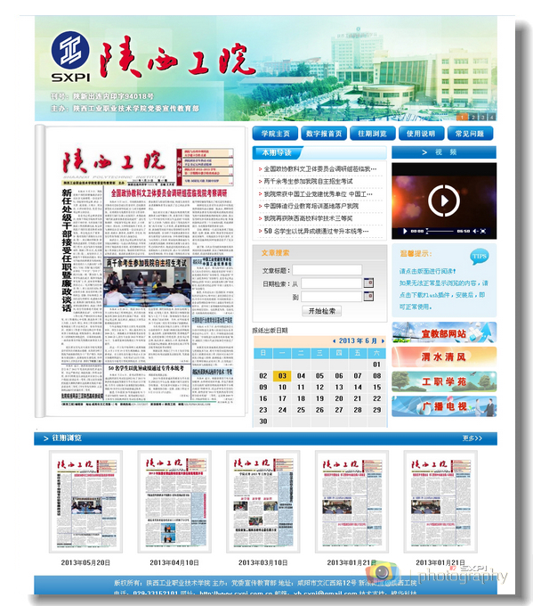 该网站采用目前国内最先进的数字报技术,发刊时间与纸质报纸一致,每月15日更新。通过一段时间的运行完善,将可以查询出版的全部43期报纸。网站整体风格清爽明快,功能实用,并提供了文章检索、留言打分等功能,读者可根据自己的喜好缩放字体,发表自己的体会和看法。《陕西工院》数字报的上线,是我院校园媒体“报网合一”的又一突破,也为师生及时了解学院、最新资讯提供了便捷的平台。