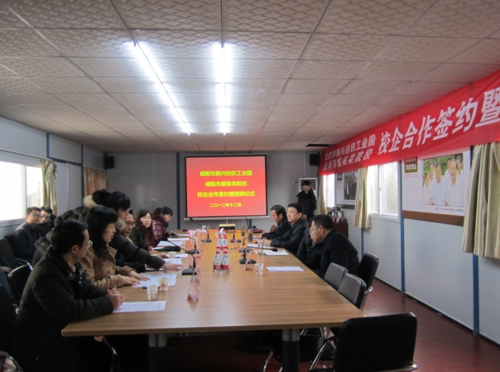 会上,刘主任介绍了咸阳市新兴纺织工业园的建设情况,他说,咸阳市新兴纺织工业园是我省计划用五年时间重点打造的新型示范工业园区,占地10平方公里,建成后园区工业总产值达350亿元,实现利税30亿元,园区纺织工业生产纱锭规模达到100万枚,无梭织机达到5000台,从业人员达6万人。为做好人才和技术储备,并为2013年投产开园做准备,园区积极寻求与纺织服装类院校合作,同时希望通过校企合作打造人才培养、学生实习、企业技术服务的公共平台。