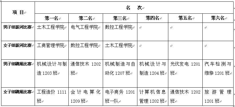 本届冬运会开设项目有拔河比赛和跳绳比赛,从2012年11月中旬拉开帷幕,经过训练、选拔赛,十个二级学院的男女生拔河队、74个男生跳绳代表队和56个女生跳绳代表队分别进入学院的总决赛。最终,土木工程学院和工商管理学院分获男子组拔河和女子组拔河第一名,机械设计与制造1203班和机械设计与制造1203班分获男子组跳绳和女子组跳绳第一名。