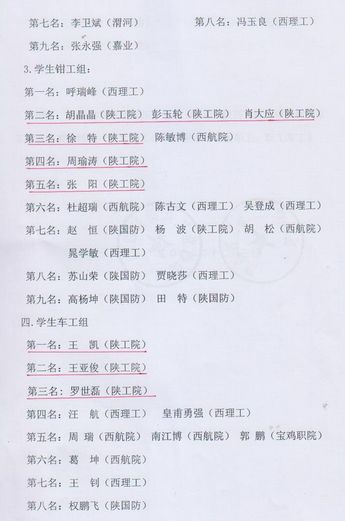 日前,由陕西省模具协会“关于2012年陕西省哈斯·恒通·嘉业陕西工院杯模具钳工车工技能大赛成绩的通知”(省模协〔2012〕021号)获悉,我院机械工程学院12名学生组成2支代表队喜获佳绩,勇夺学生组车工和钳工两个团体第一,学生组车工个人成绩的前三名、钳工组个人成绩的第二、三名。