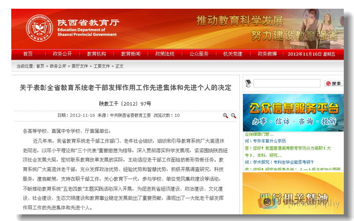 日前,中共陕西省委教育工委、省教育厅做出“关于表彰全省教育系统老干部发挥作用工作先进集体和先进个人的决定”(陕教工干〔2012〕97号),对我省教育系统一批老干部发挥作用工作措施得力、成效显著的老干部工作部门、老年社会组织和离退休老干部进行表彰。我院离退休工作处等34个老干部工作部门被授予“全省教育系统老干部发挥作用工作先进集体”荣誉称号,我院退休教师王颖哲等25名同志被评为“全省教育系统老干部发挥作用工作先进个人”荣誉称号。