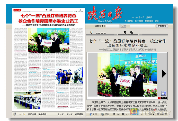6月24日,《陕西日报》第六版以《七个“一流”凸显订单培养特色,校企合作培育国际水准企业员工》为题,报道我院携手欧姆龙公司实施人才订单培养的办学历程。