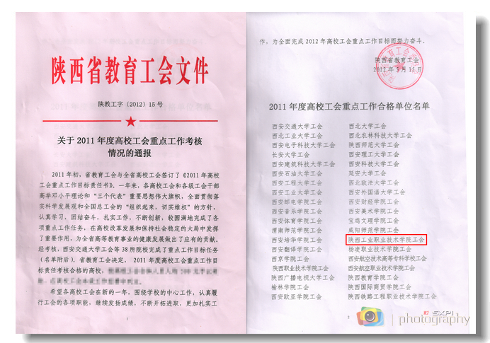 日前,陕西省教育工会发出《关于2011年度高校工会重点工作考核情况的通报》(陕教工字〔2012〕15号),通报了包括我院工会在内的38所院校完成了2011年重点工作目标任务,经省教育工会考核合格。