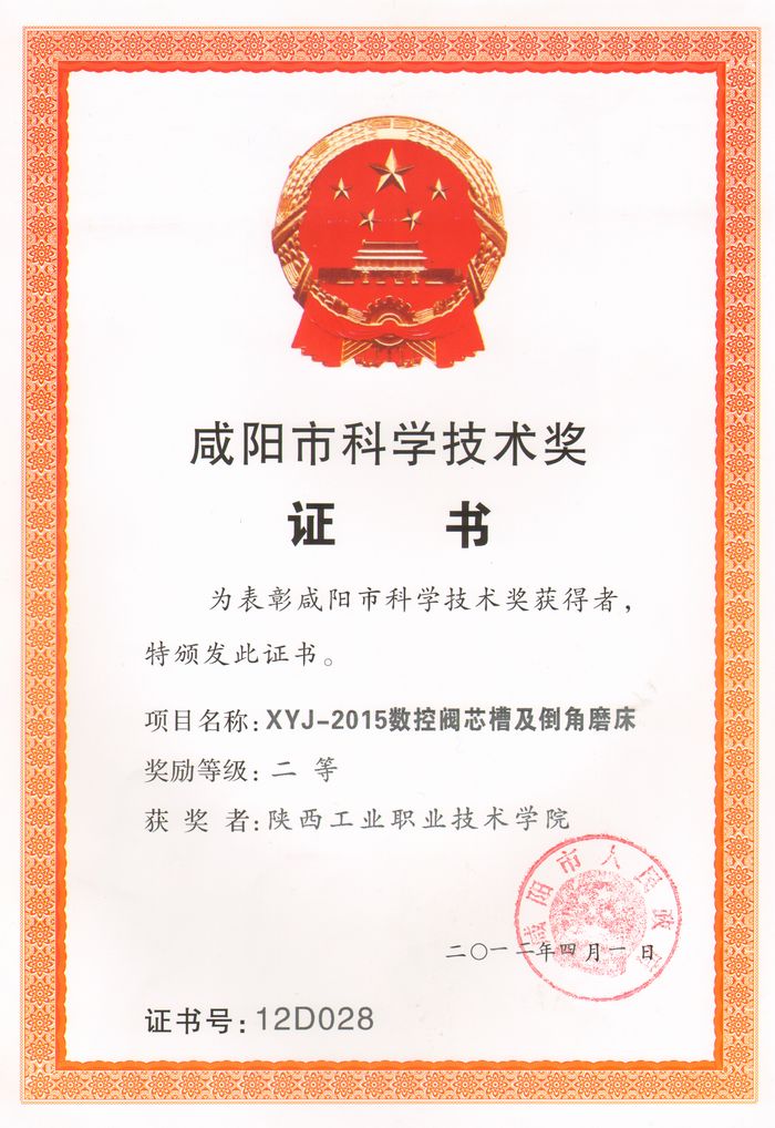 近日,接咸阳市科学技术局《关于颁发二0一一年度咸阳市科学技术奖获奖项目的通知》(咸政科【2012】30号),我院申报的“XYJ-2015数控阀芯槽及倒角磨床”项目,经专业评审组评审、评审委员会综合审核,最终获得“咸阳市二0一一年度科学技术奖励”二等奖。