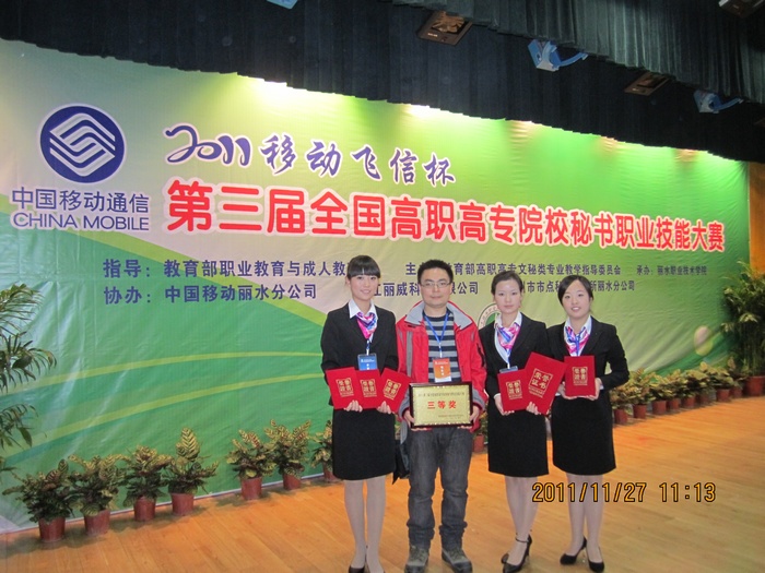 近日,由教育部高职高专文秘专业教学指导委员会主办的第三届全国高职高专院校秘书职业技能大赛在浙江丽水职业技术学院圆满落幕,我院文秘专业代表队唐云飞、张祯、刘逸3名同学发挥稳定,分别获得个人综合三等奖;我院代表队获得团体三等奖;此外,刘逸同学发挥出色,斩获最佳才艺奖,并参加了汇报演出;指导老师来保卫获得“优秀指导教师奖”。