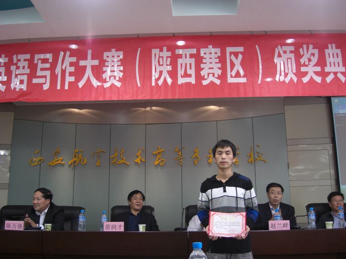 9月29日下午,第二届全国高职高专英语写作大赛(陕西赛区)颁奖典礼在西安航空技术高等专科学校举行。陕西省教育厅高教处袁宁处长,陕西高职高专学会苗润才理事长等领导出席颁奖典礼并为获奖选手颁发证书。我院选手获得公共英语组特等奖一项,三等奖一项。